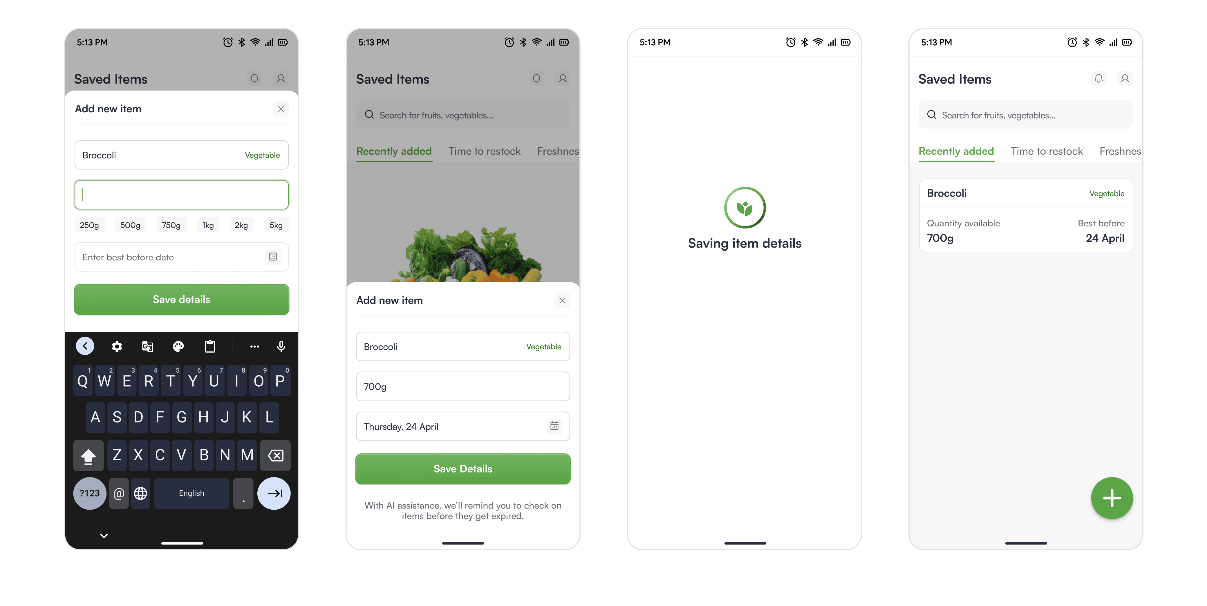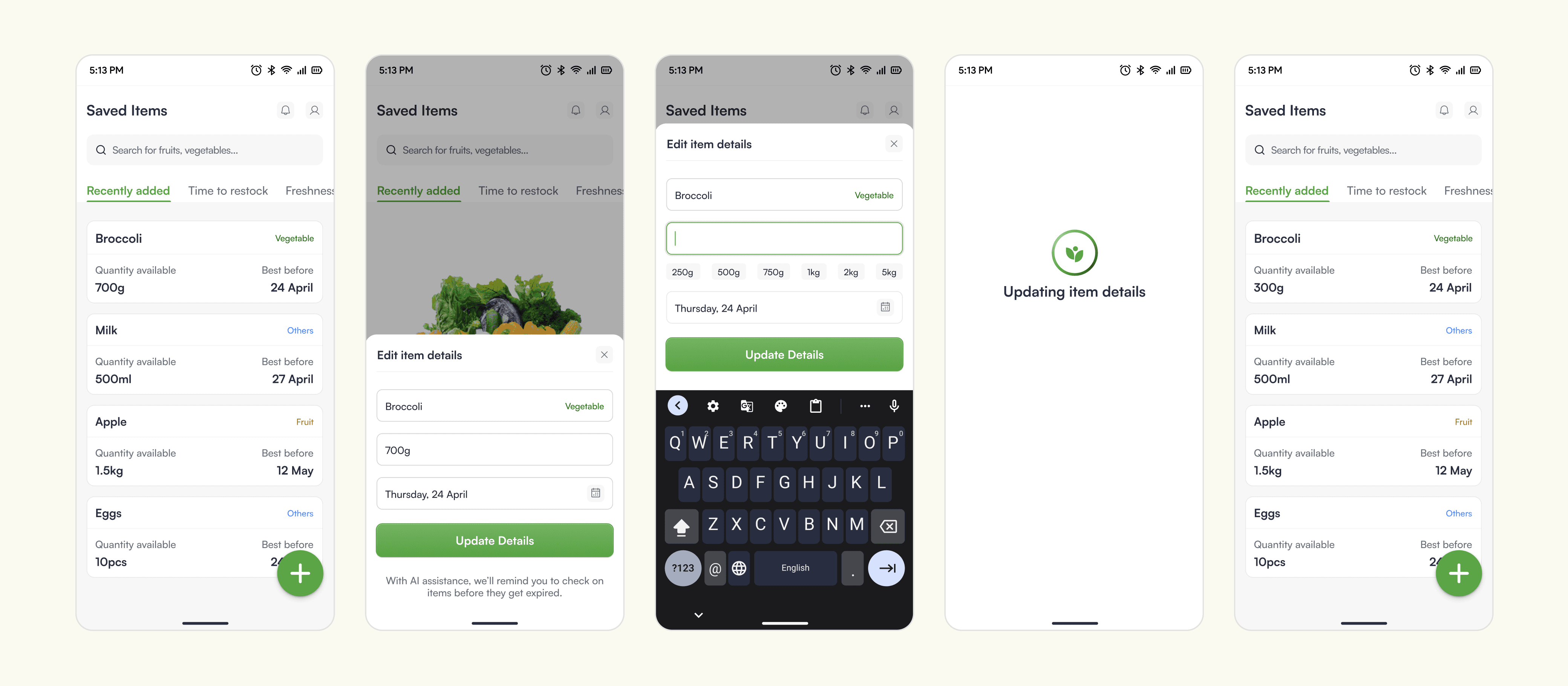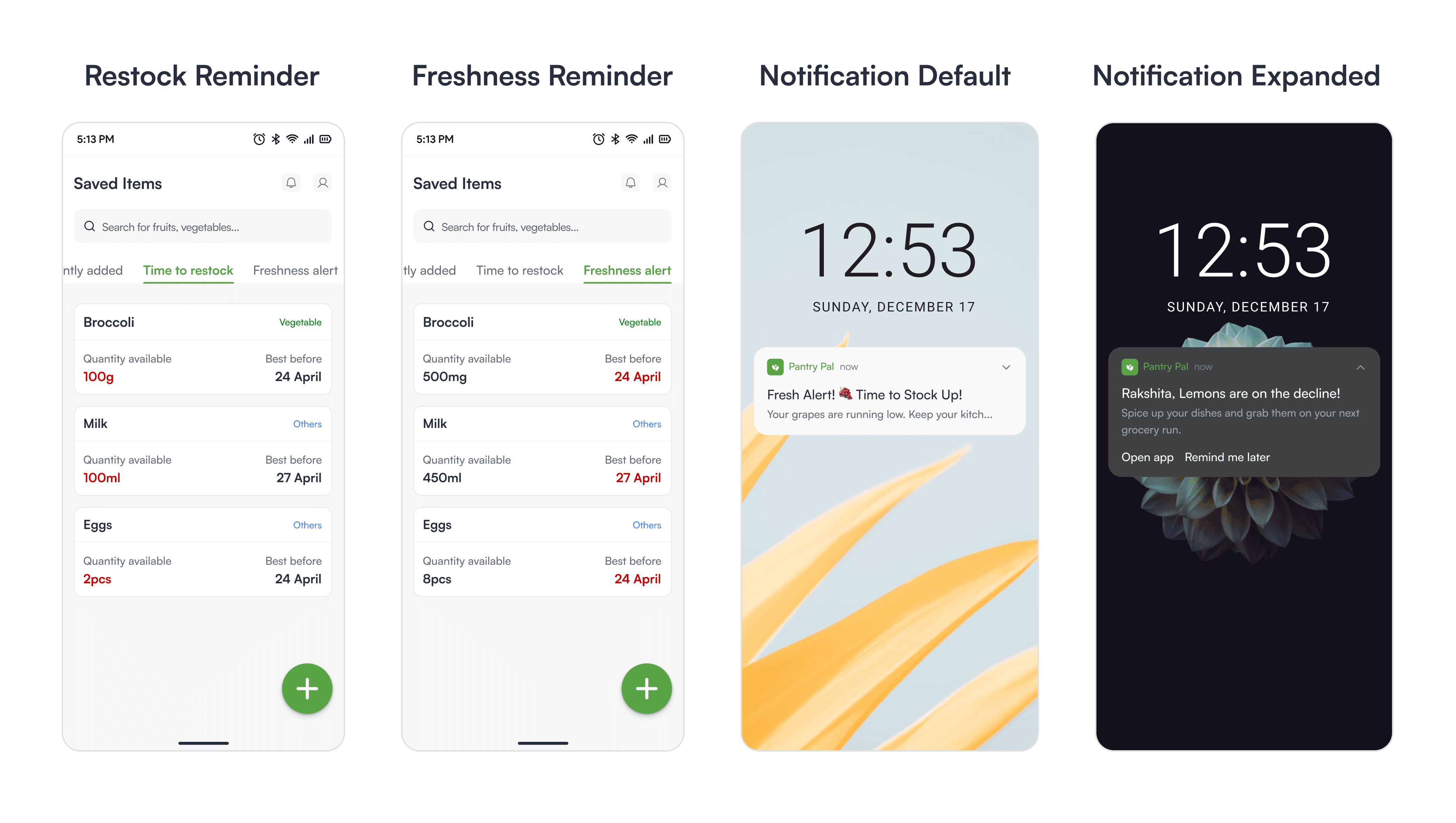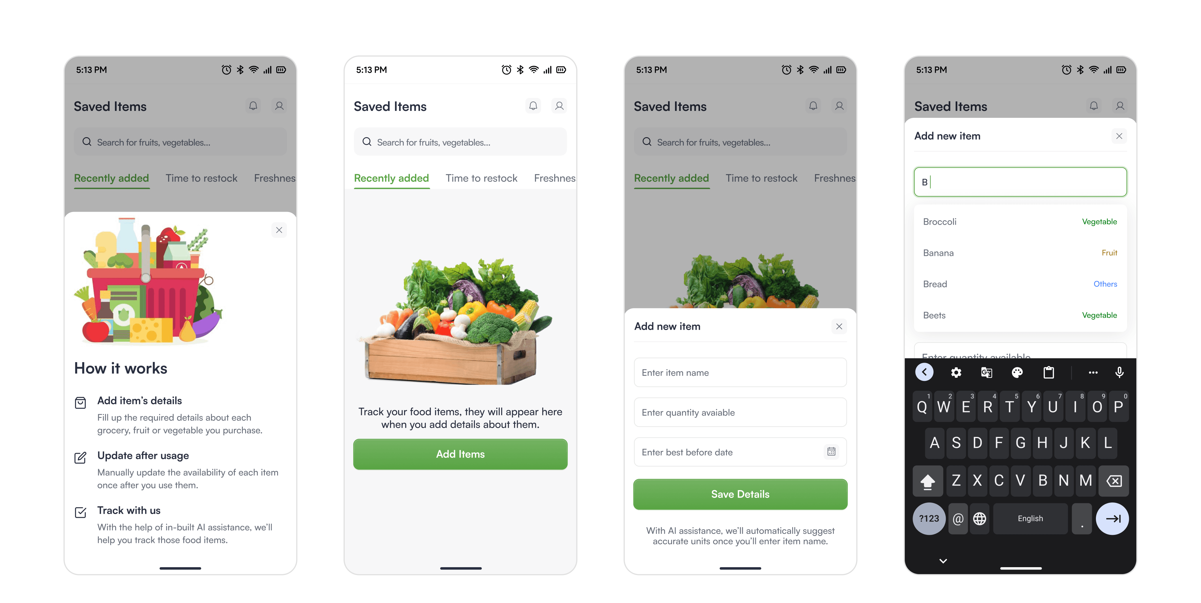 Design a mobile app with a few key flows to track groceries, vegetables and fridge items in the kitchen to reduce the food wastage and to efficiently manage kitchen stock.